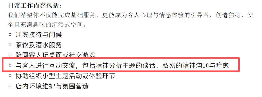 招聘启事上还声明,应聘人员要具备“与客人进行互动交流的能力,提供精神分析主题的谈话、私密的精神沟通与疗愈的服务”。
