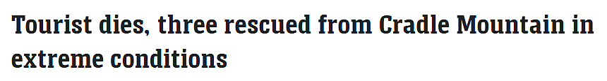 2014年,在同样属于塔斯马尼亚国家公园的Overland Track,一名21岁的中国留学生因体温过低死亡。当时风速高达每小时60公里,阵风甚至达到100公里,暴雨持续,直升机无法出动。