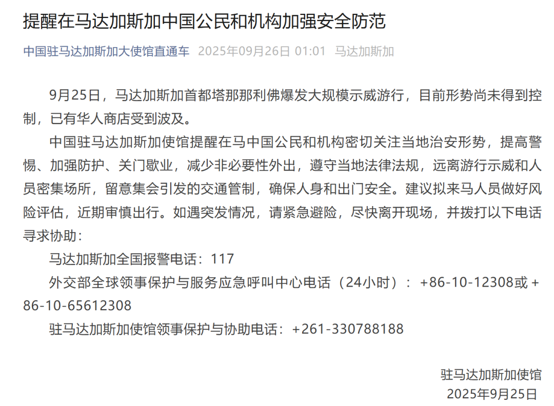 另据“中国驻马达加斯加大使馆直通车”微信公众号9月26日发布的消息,9月25日,马达加斯加首都塔那那利佛爆发大规模示威游行,形势尚未得到控制,已有华人商店受到波及。