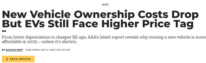 AAA 在报告中强调:电动车的“拥有成本”(折旧、保险、牌照和融资)通常抵消了能源带来的费用优势,甚至还得自己贴钱。
