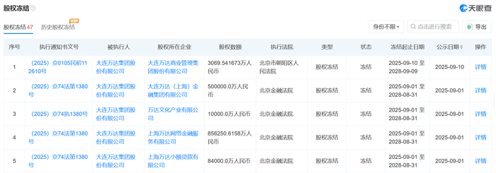 此外,天眼查数据显示,大连万达集团还有共计有47条股权冻结信息,被冻结股权的标的企业涉及大连万达商业管理集团股份有限公司、大连万达(上海)金融集团有限公司、万达文化产业有限公司、大连万达集团商务服务有限公司等。其中,今年9月以来,共有5条股权冻结信息,被冻结股权145.33亿元。目前,王健林名下有42家公司,仅10家处于存续或者迁出状态,其余处于吊销或者注销状态。