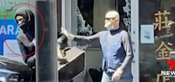 3名劫匪身穿深色衣服,戴有口罩,他们闯入后砸开了华人金店里面的橱柜。