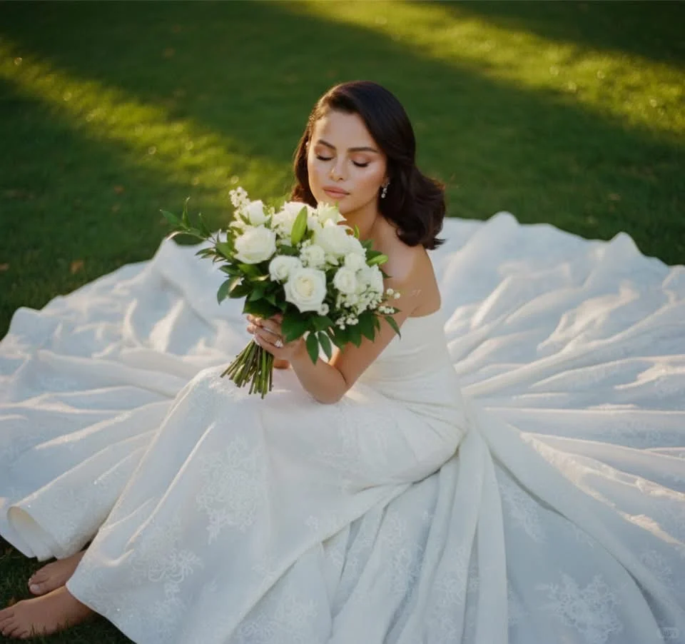 而身穿一袭白色挂脖露背婚纱的赛琳娜,手捧着花束坐在草坪上,显得格外的优雅迷人。