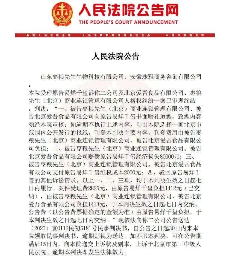 9月30日,极目新闻记者注意到,据人民法院公告网显示,近日,北京市通州区人民法院向山东枣粮先生生物科技有限公司、安徽珠雅商务咨询有限公司送达原告易烊千玺起诉前述两家公司及北京爱吾食品有限公司、枣粮显示(北京)商业连锁管理有限公司人格权纠纷一案民事判决书。内容显示,法院判决后述两家公司向易烊千玺书面赔礼道歉,赔偿经济损失、维权成本共计8.2万元。