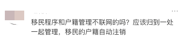 “移民程序和户籍管理不联网的吗?应该归到一处一起管理,移民的户籍自动注销。”