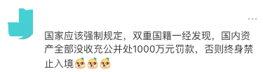 “国家应该强制规定,双重国籍一经发现,国内资产全部没收充公并处1000万元罚款,否则终身禁止入境。”
