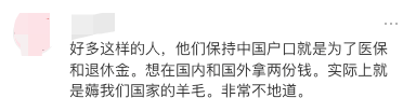 “好多这样的人,他们保持中国户口就是为了医保和退休金。想在国内和国外拿两份钱。实际上就是薅我们国家的羊毛。非常不地道。”