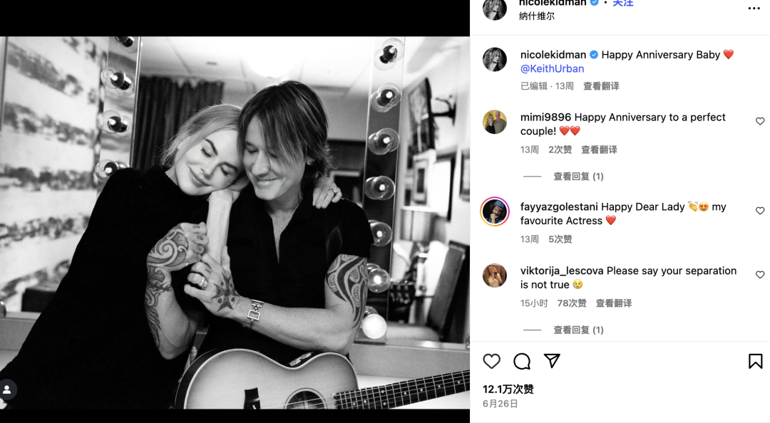 回想今年6月,他俩还合体在纳什维尔看世界杯,妮可在ins庆祝结婚19周年,晒出后台贴额头的黑白照配文“周年快乐宝贝”。