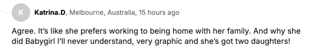 “同意。她好像更喜欢工作而不是在家陪家人。我永远也搞不懂她为什么要拍《宝贝女孩》,太露骨了,而且她还有两个女儿!”