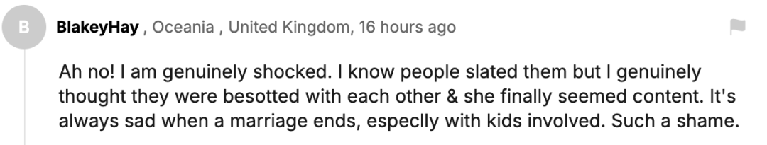 “唉,真是没想到!我实在感到震惊。虽然知道外界对他们有不少批评,但我真心以为他们深爱着彼此,而且她终于显得心满意足了。婚姻走到尽头总是令人难过,尤其还涉及到孩子。真是太遗憾了。”