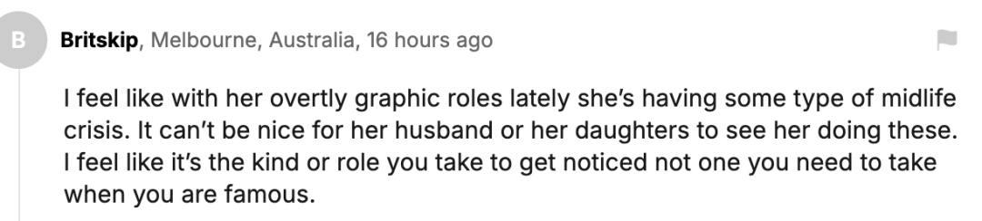 “我觉得她最近出演的那些露骨角色,让她感觉像是在经历某种中年危机。她的丈夫和女儿看到她演这些角色肯定不高兴。我觉得这种角色是为了吸引眼球才接的,不是成名之后才需要接的。”