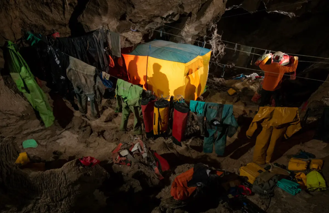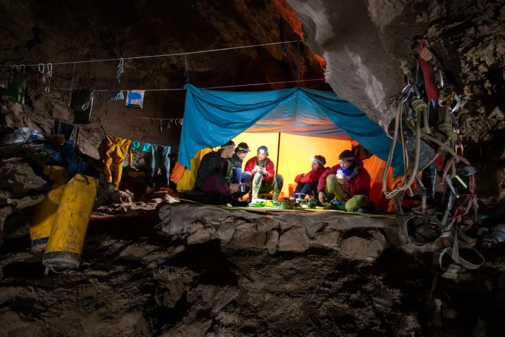 佩罗沃队在地下搭建了四个永久营地,380 米、610 米、1000 米、1350 米,放着帐篷、炉具、燃料、食物和应急物资,供探险队休整、补给,再继续往下。