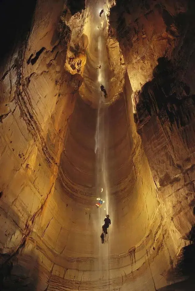 内部蜿蜒曲折,竖井、瀑布、暗河和狭窄通道层层叠叠,像一座立体迷宫。