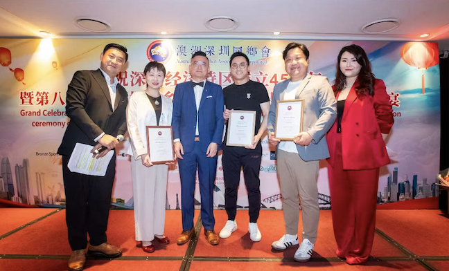 悉尼多位副市长及市议员在发言中肯定了深圳同乡会对当地社区的贡献。他们表示:“深圳同乡会不仅为华人社区提供了互助平台,更通过文化交流、公益活动促进了悉尼的共融。期待未来与同乡会深化合作,共同推动发展。”晚会亦特意奖励品学兼优深圳移民二代以鼓励积极向上的精神和树立好学的榜样。三位得奖者是Dr Chi Mao、Andy Yu 和Christine Huang。现场同时为前任理事会成员颁发感谢状,他们分别是陈慧俊、华乙静、袁校初、张志鹏以及曾国柱,感谢他们为同乡会的付出和奉献!