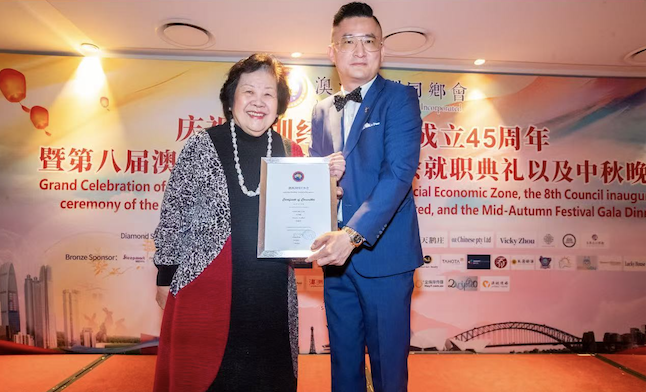 会长Jimmy Zhang为荣誉会长何沈慧霞博士(前新州上议院副议长和澳大利亚华人第一位上议员)颁发聘书。
