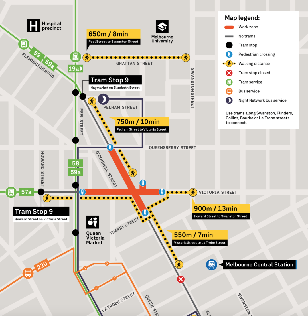 为保障电车网络安全与准点,维州公共交通部门将于10月6日(周一)晚7点至10月26日(周日)在墨尔本Victoria St × Elizabeth St路口附近实施路轨与路口设施维护。其间多条电车线路将分段停运、改道运行,并由接驳巴士替代,相关路段人行道保持开放但可能临时封闭部分通行点,请按现场指示绕行。