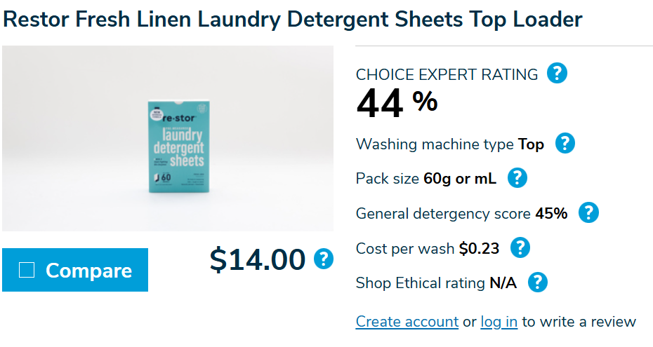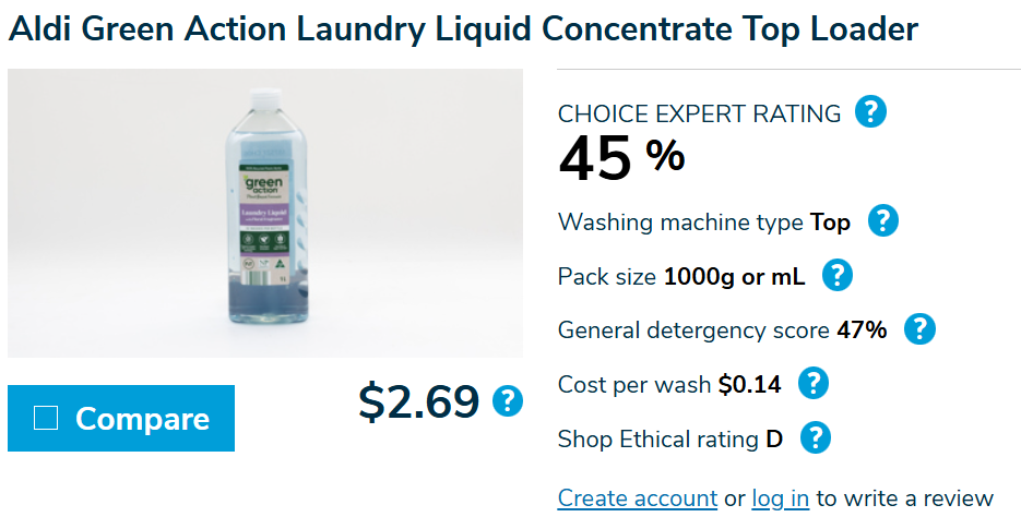 在非洗衣片的洗衣用品中,表现较差的一款是Aldi 的Green Action洗衣液浓缩液(用于滚筒洗衣机),其得分仅为45%。