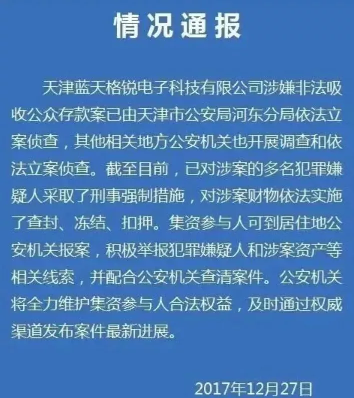 几天后消息传来,蓝天格锐被天津警方以非法吸收公众存款罪查封,钱志敏和公司管理层全部跑路。