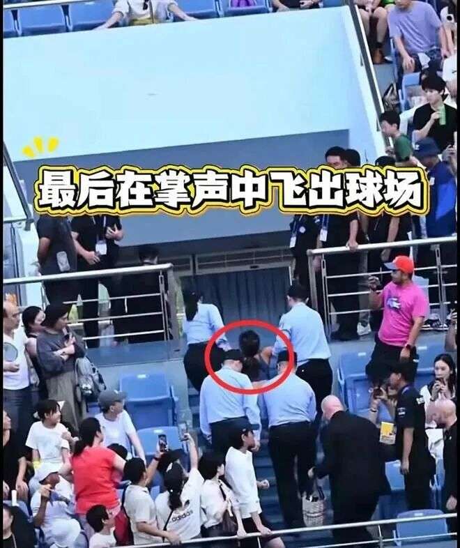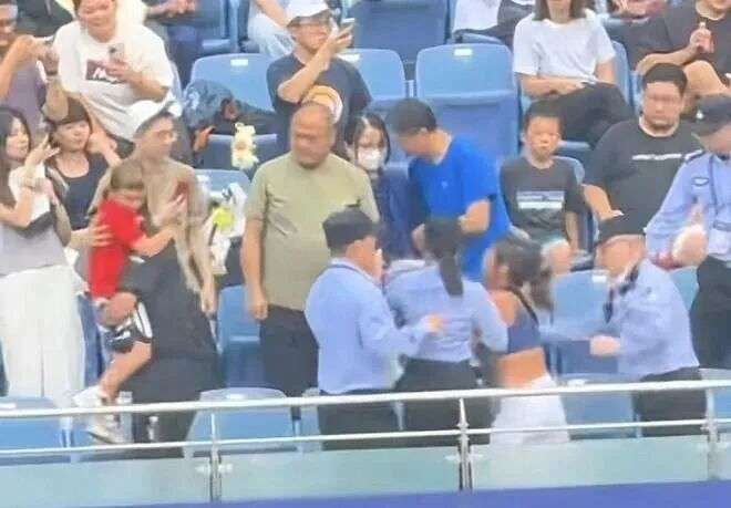 最终,警方和安保人员在最后一次劝阻,请她主动离开比赛现场依旧无效的情况下,强行将“短裙姐”带离看台,