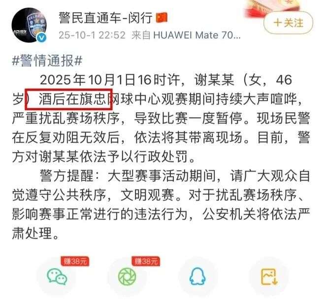 上海市公安局闵行分局1日晚发布警情通报,称46岁女子谢某某在旗忠网球中心观赛期间持续大声喧哗,严重扰乱赛场秩序,导致比赛一度暂停。现场民警在反复劝阻无效后,依法将她带离现场。目前,警方对其处以行政处罚。