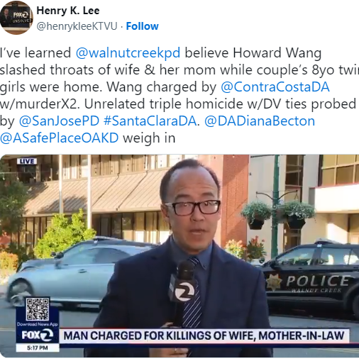 报案人是43岁的华裔男子霍华德·王(Howard Wang)。他告诉警方,当晚他推开家门时,赫然发现一个陌生男子正持刀疯狂砍杀他的妻子郭琳琳(Linlin Guo,41岁)和岳母程贝敏(Beimin Cheng,64岁)。他声称自己当场开枪试图阻止,但没击中对方,对方逃之夭夭。