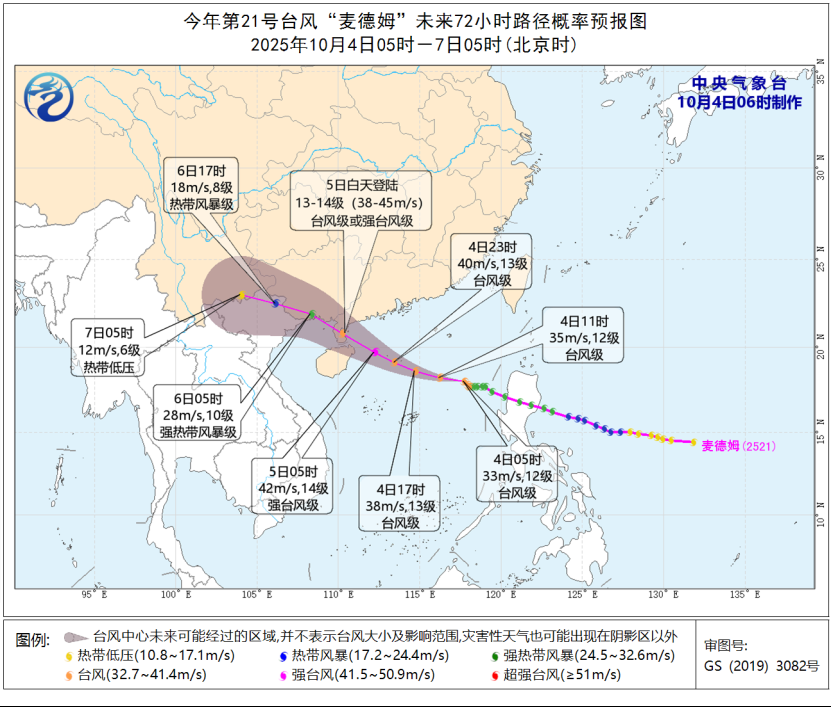 大风预报:4日08时至5日08时,巴士海峡、南海北部和中部海域、东沙群岛、西沙群岛、中沙群岛及黄岩岛附近海域、北部湾中东部、琼州海峡、广西沿海、广东西南部及沿海、海南岛及沿海、台湾岛南部沿海有5-7级、阵风8-10级的大风,其中,南海西北部海域、琼州海峡、广东西部沿海、海南岛东部和北部沿海的风力有8-11级,阵风12-13级,“麦德姆”中心经过的附近海域或地区风力可达12-14级,阵风15-16级。