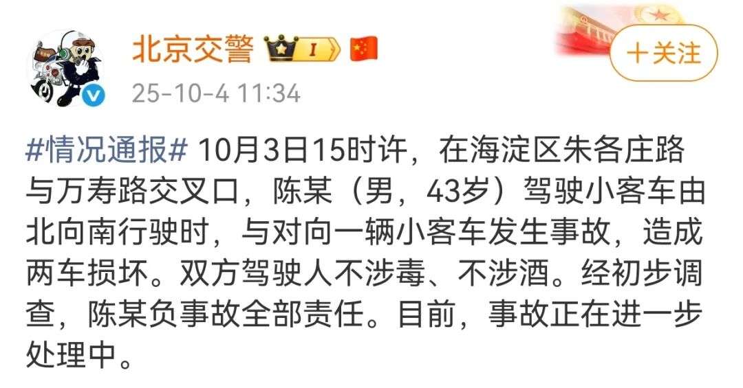 据北京交警10月4日通报,10月3日15时许,在海淀区朱各庄路与万寿路交叉口,陈某(男,43岁)驾驶小客车由北向南行驶时,与对向一辆小客车发生事故,造成两车损坏。双方驾驶人不涉毒、不涉酒。经初步调查,陈某负事故全部责任。目前,事故正在进一步处理中。