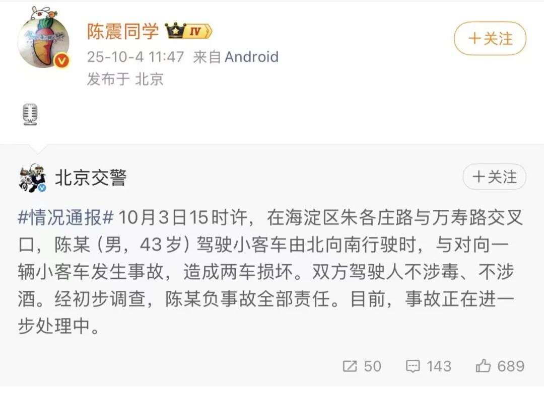 收藏陈震车祸全责,北京交警通报