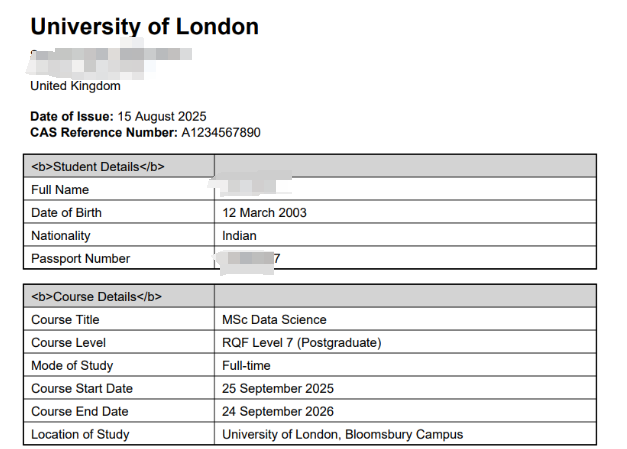CAS 上会包含你的个人信息、课程名称和起止时间、学费金额、已缴费用以及学校的担保资质等。它的主要作用是证明你确实获得了合法合规的录取资格,英国移民局会依此判断你是否符合学生签证的申请条件。