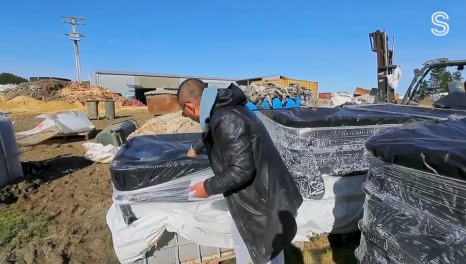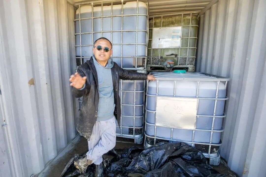 这些尸体被装入大型1000升托桶,盖上黑色塑料布,用太阳升温,加酶进行酶解,成为液体肥料。