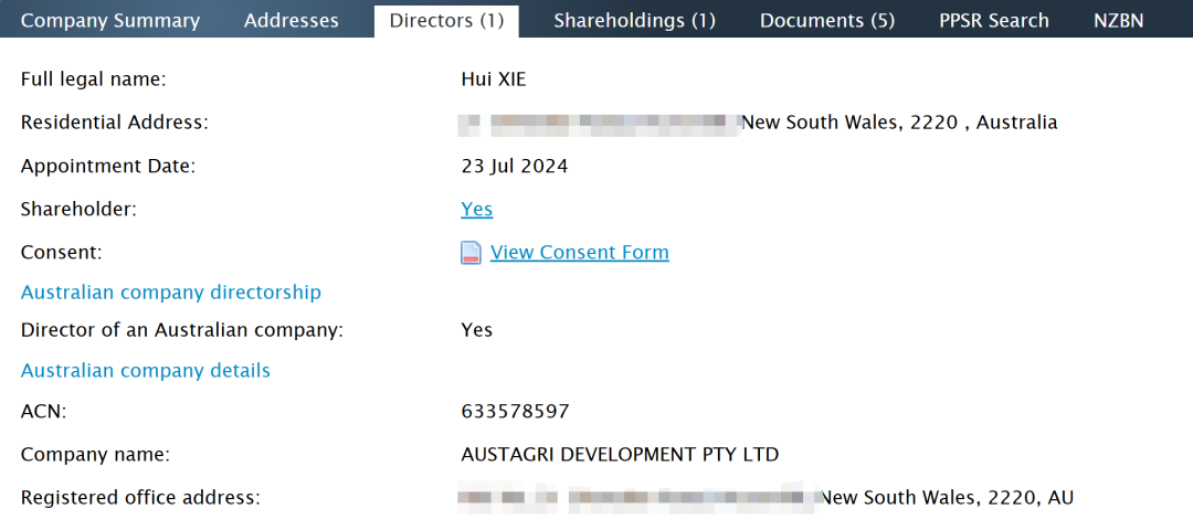 根据新西兰公司注册处信息,NZAGRI Development Ltd于2024年7月在但尼丁注册,公司唯一董事兼股东为Hui Xie,居住在澳大利亚悉尼。