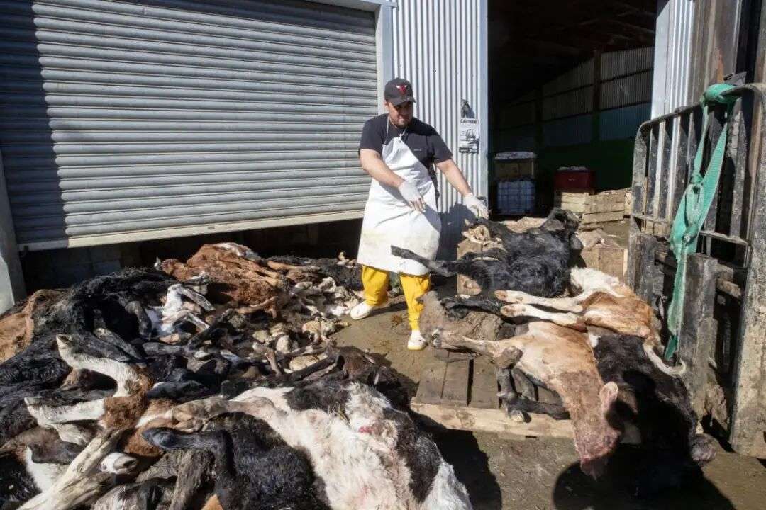 邻近的居民说,自从工厂去年易主后,厂区就开始堆放成堆的羊羔和小牛尸体。