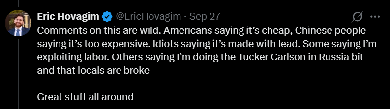 帖子一出,评论区瞬间炸锅。Hovagim 总结道,“美国人留言‘太便宜了!’中国网友留言‘太贵了!’有人质疑是不是在剥削劳工?还有人阴阳怪气,说这是‘模仿塔克·卡尔森跑去俄罗斯拍片那一套’。总之,评论区热闹得很。”
