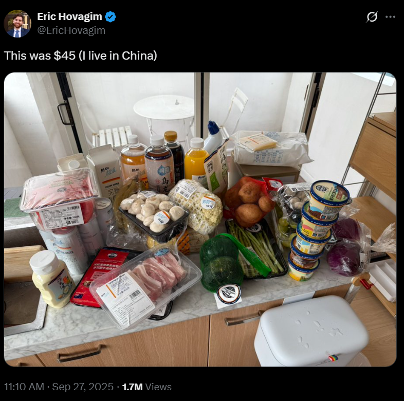 最近,美国小哥 Eric Hovagim 在 X(推特)上晒出一条视频:“45刀在中国能买到啥”,结果一夜爆火。