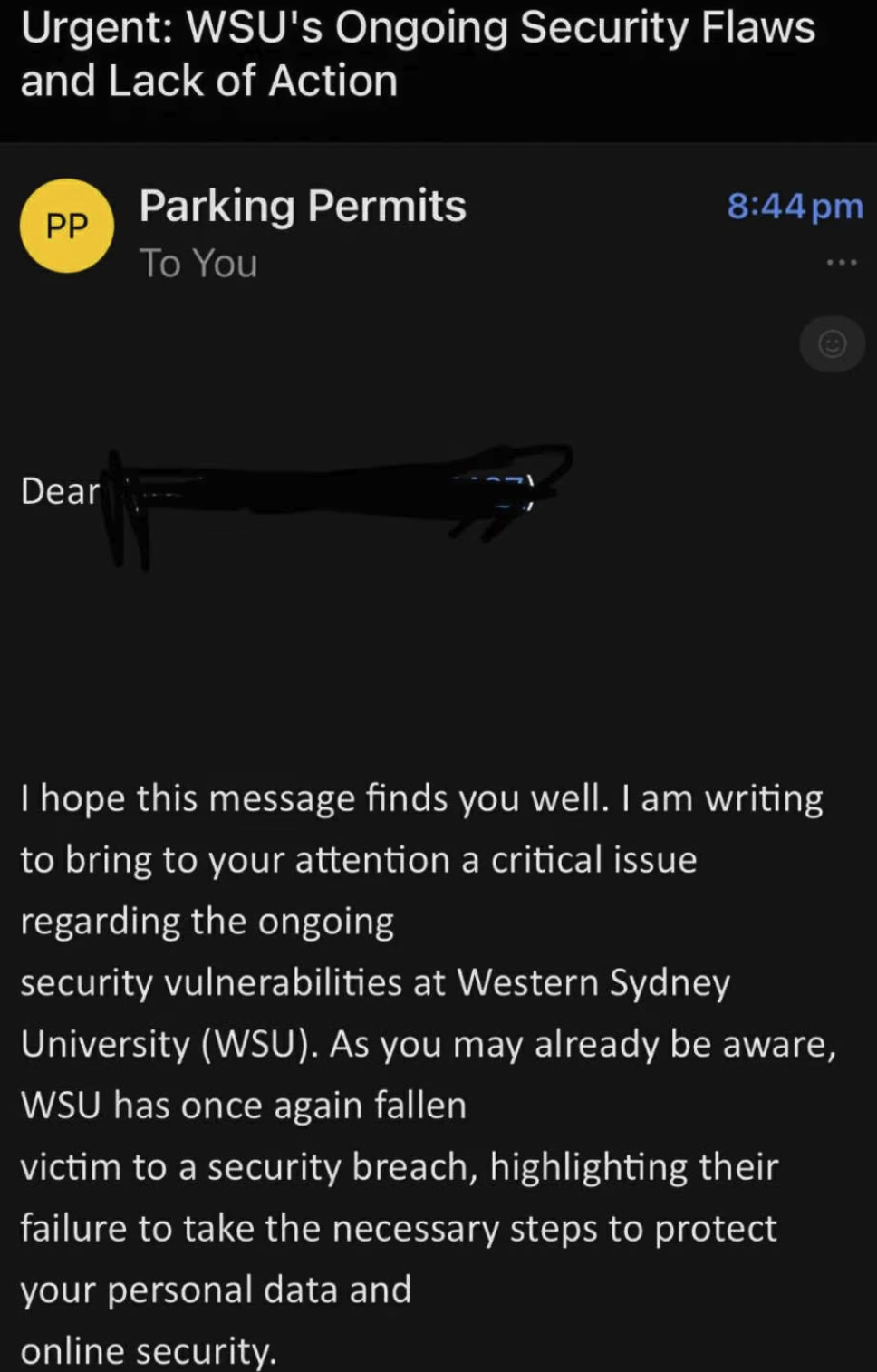 在社交平台上,受害者纷纷晒出邮件截图。部分邮件署名为“no-email”,要求收件人“交回原始学位文件”;另一封邮件则题为《WSU安全漏洞与失职警告》,直指校方系统存在“长期安全漏洞”,甚至称“学生成绩可能被篡改”。邮件指控西悉尼大学自2017年以来多次被曝存在安全问题,却未采取有效防护措施。