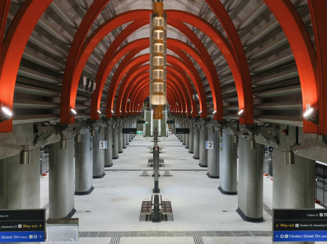 Metro Tunnel自2017年动工以来,经历了预算翻倍、施工延期及CBD封路等一系列波折,如今终于完工。项目共设五个全新地下车站:Anzac、Town Hall、State Library、Parkville与Arden,其中Town Hall与State Library站深达42米,可与Flinders Street Station和Melbourne Central无缝换乘。