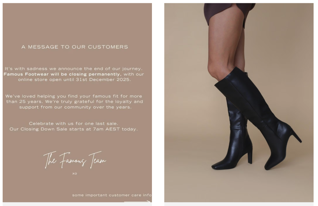 Famous Footwear于周一通过社交媒体宣布消息,表示“售完即止”。这家品牌以高性价比女鞋闻名,在昆士兰、新南威尔士与维多利亚共拥有17家门店,并雇佣超过200名员工。公司在公告中写道:“我们怀着沉重的心情宣布旅程的结束。Famous Footwear将永久关闭,我们的线上商店将营业至12月31日。非常感谢大家这些年来的支持与陪伴。”