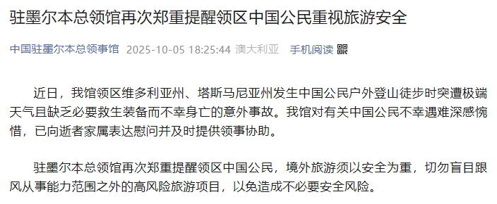 正值“十一”长假,到澳洲旅游的中国游客很多。中国驻墨尔本总领馆再次发布紧急提醒,游客千万要注意安全。