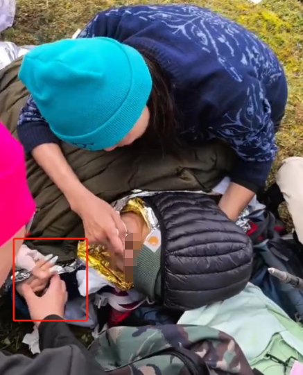 为了保住她的体温,驴友们纷纷脱下自己的外套、毛衣,一层层盖在女生身上。