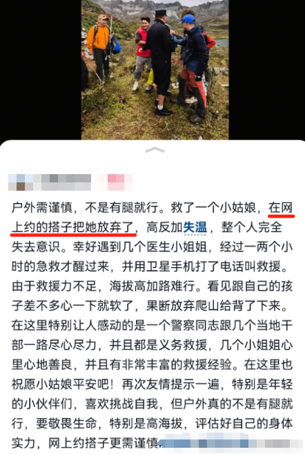 众多网友有对救援人员的夸赞,也有对“全女登山团”队友的弃置行为表示强烈愤慨。