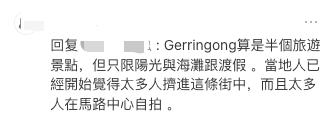 “Gerringong算是半個旅遊景點,但只限陽光與海灘跟渡假。當地人已經開始覺得太多人擠進這條Tasman Drive街中,而且太多人在馬路中心自拍。”