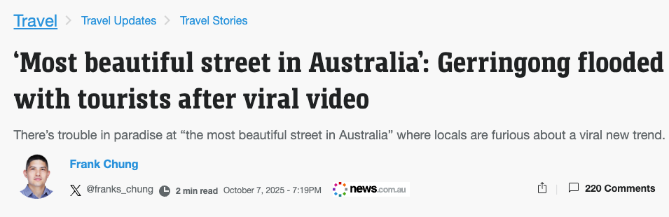 新州南海岸的小镇 Gerringong,因为一条“澳洲最美街道”的视频,在短短几周内被游客彻底“攻陷”!