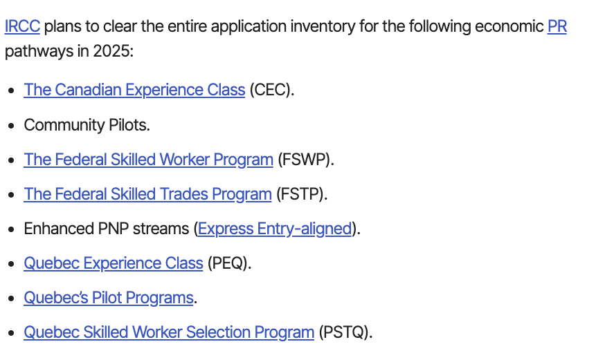 根据移民部最新的部长过渡文件(Minister Transition Binder),只有快速入境通道(EE)、省提名计划 (PNP) EE类别 、社区试点项目以及魁北克技术工人类别将在 2025 年完成全部申请的处理。