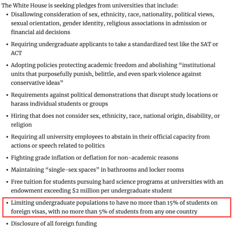 这份《高等教育学术卓越契约》最初在10月初由白宫发布,寄送给麻省理工学院、宾夕法尼亚大学、南加州大学、达特茅斯学院、布朗大学、德州大学奥斯汀分校、亚利桑那大学、范德堡大学与弗吉尼亚大学等九所顶尖高校。