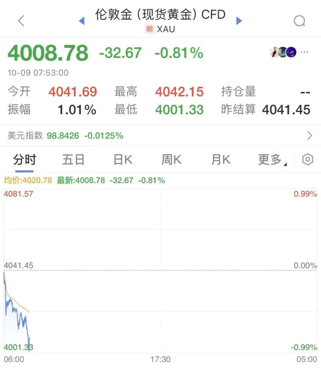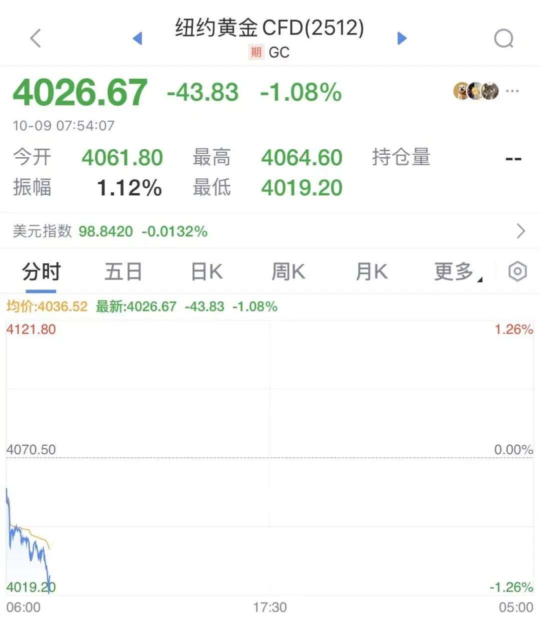 10月9日,国际金价直线跳水。现货黄金一度从4040美元上方跌至4001美元;纽约黄金期货瞬间跌超1%。