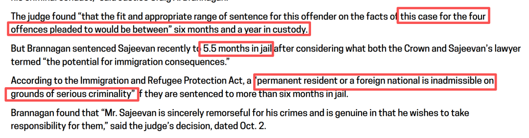 目前,萨吉万已在服刑中,虽然被判的刑期可能刚好卡在了不用被驱逐出境的“门槛”,但他服刑期满后还是有可能因犯罪记录,而失去在加拿大继续居留的资格。