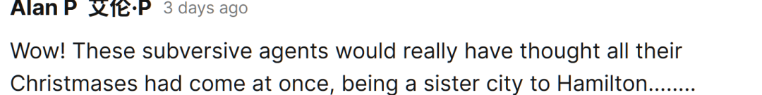 还有人说:“哈哈,这些颠覆分子估计要乐疯了吧——能和汉密尔顿结成姐妹城市,简直像一口气过完所有圣诞节!”