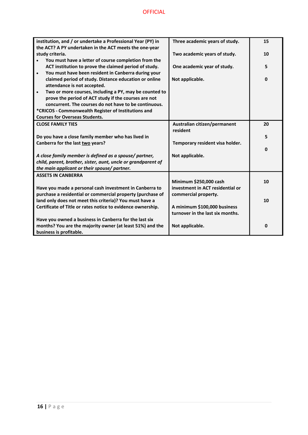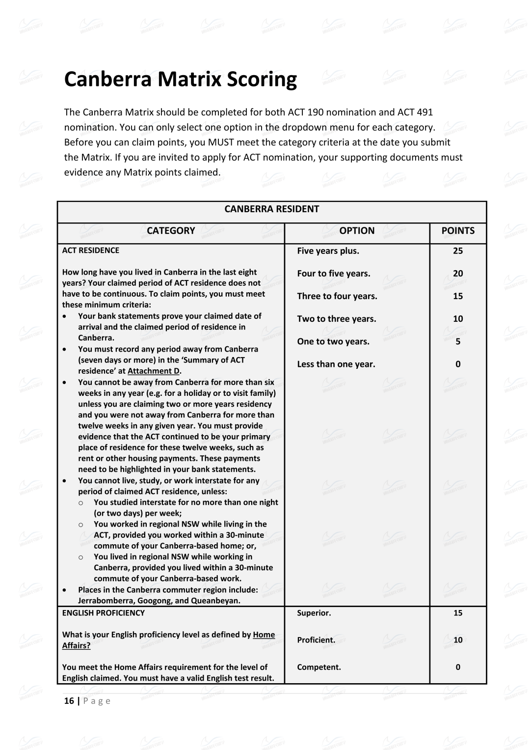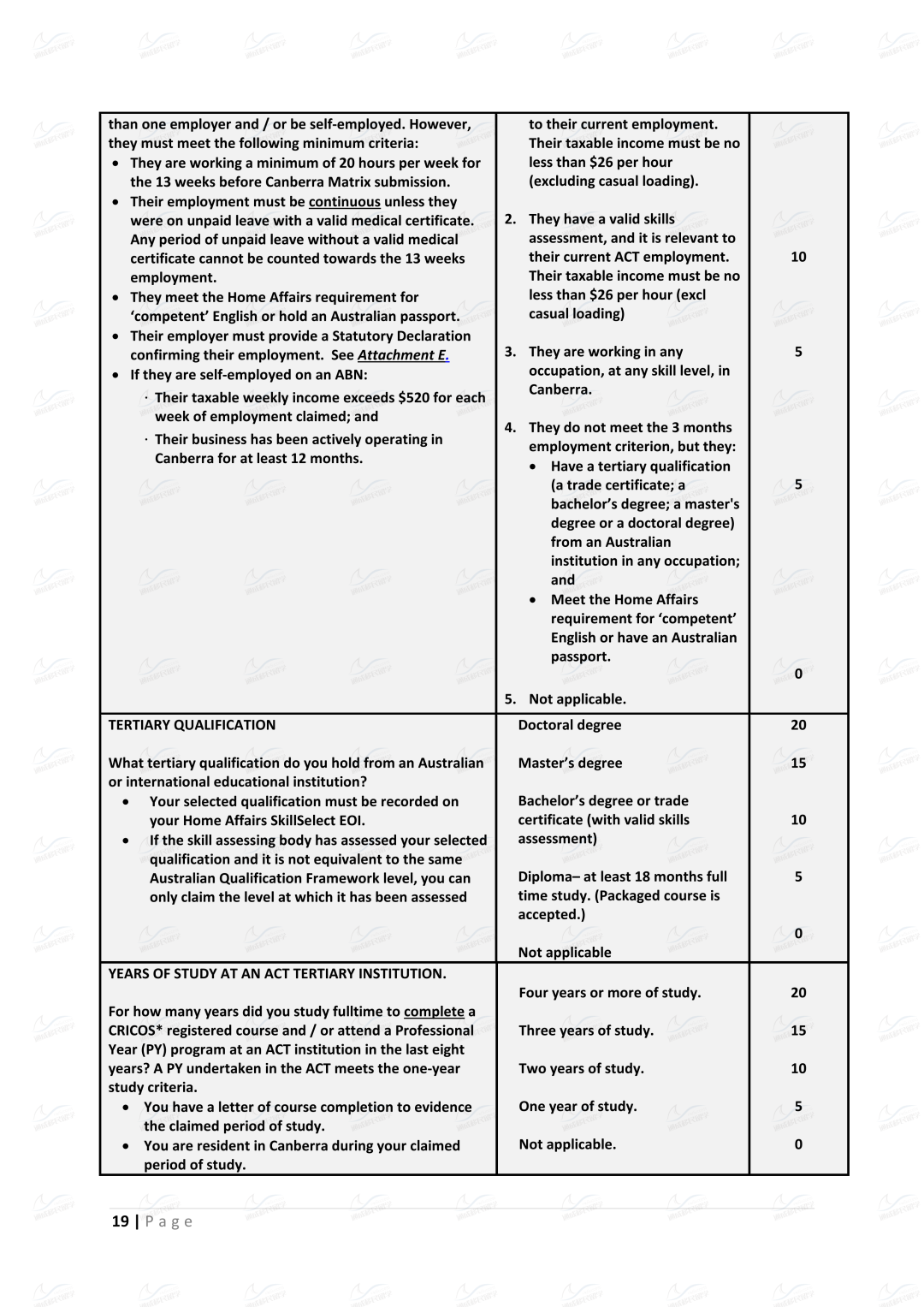 ACT有自己单独的Matrix打分表,与澳洲移民局的EOI打分表有所不同。Matrix打分表对于申请人在堪培拉的居住时间、工作offer、配偶情况有着额外的关注。相对而言,对于在堪培拉读书、工作、生活的申请者而言,Matrix的分数更容易获得!