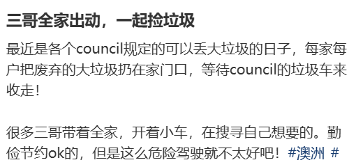 据一位在澳华人发布的社交媒体帖子描述,近期正值当地Council安排的大件垃圾回收期,不少印度裔家庭集体出动,驾驶私家车在社区内搜寻被丢弃的可用物品。