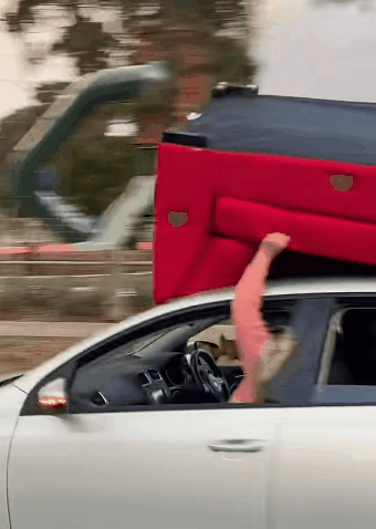 视频显示,一个印度家庭正将一座大型红色沙发放置在轿车车顶,疑似因缺乏固定绳索,行驶过程中包括司机在内的所有乘客纷纷从车窗伸出手臂,共同扶住车顶的沙发以防其滑落。